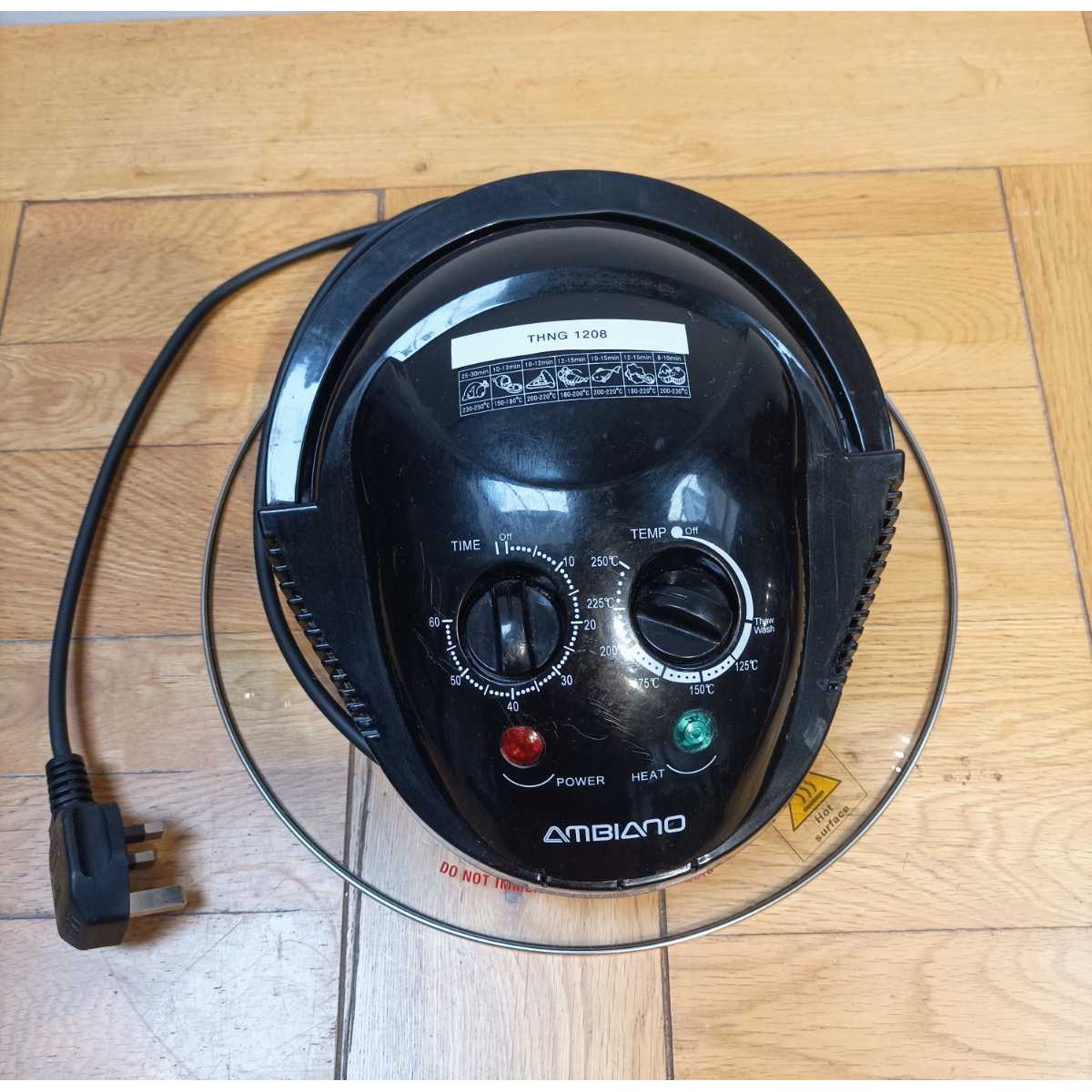 A halogen air fryer (17L). Can heat up from 125 degrees Celsius to 250. Able to cook turkey, gammon, pizza, lobster, fish, general meat and poultry and desserts like muffins and cakes. Has 7 components (including oven lid and oven itself).