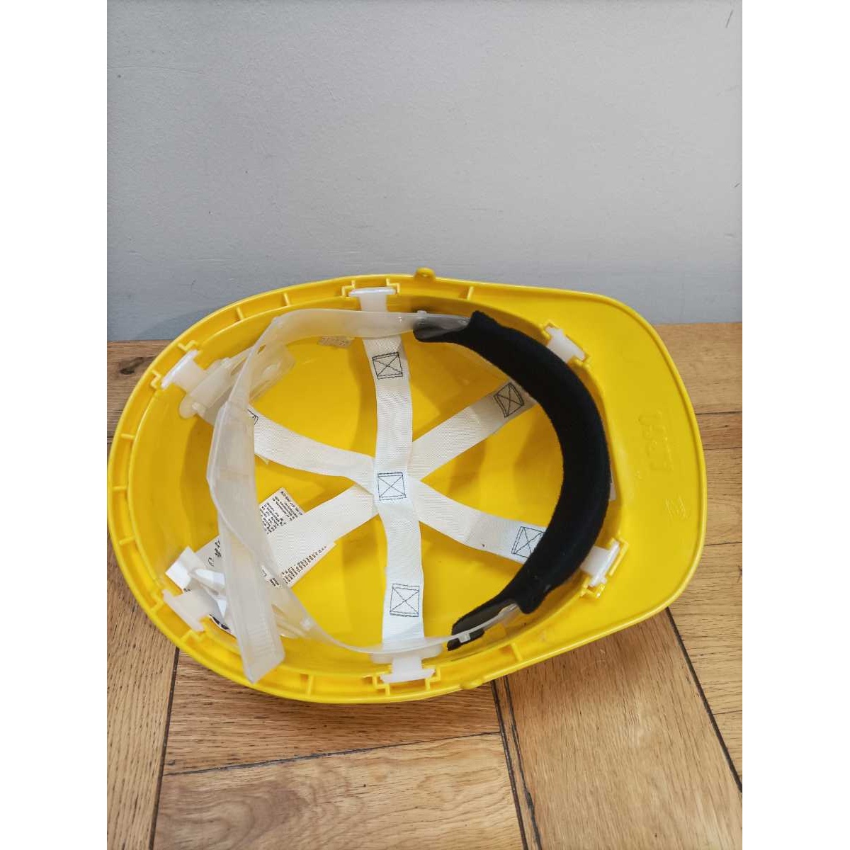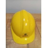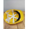 Yellow construction helmet able to fix on ear muffs, wielding shields and face screens. No strap attached.