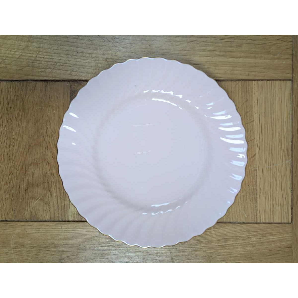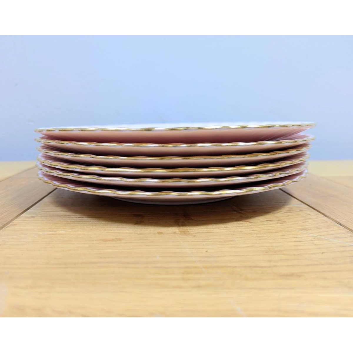 Vintage swirled and fluted Fife shell pink bone china salad/ dessert plates, with gold rim. In excellent condition.