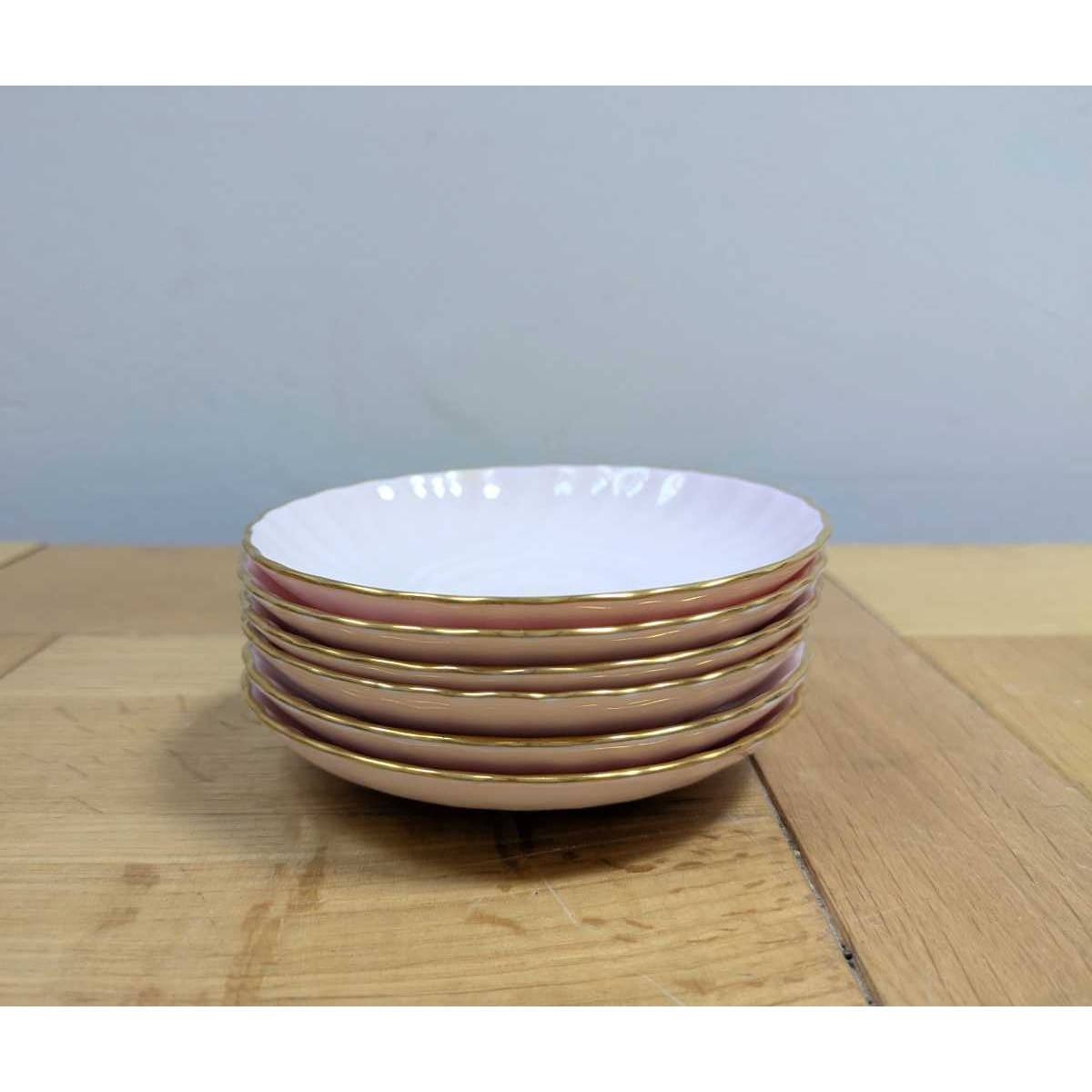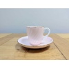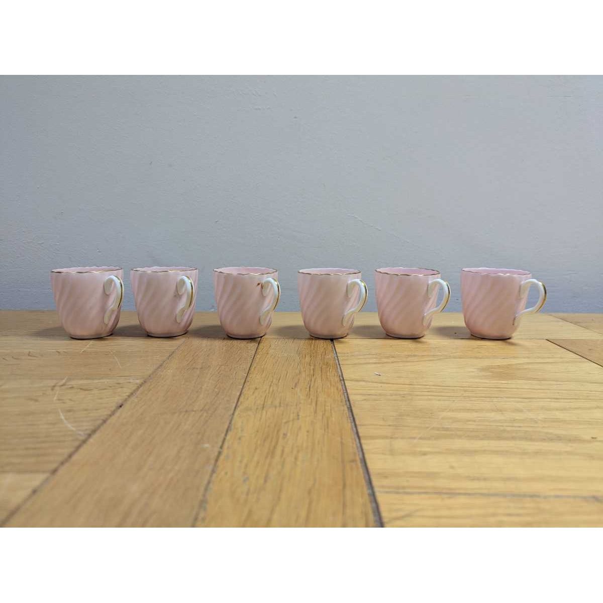 Vintage swirled and fluted Fife shell pink Espresso cups and saucers, with gold rim.