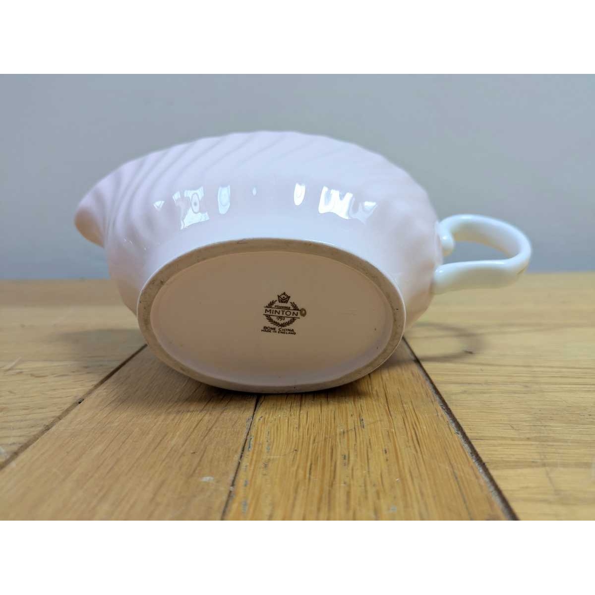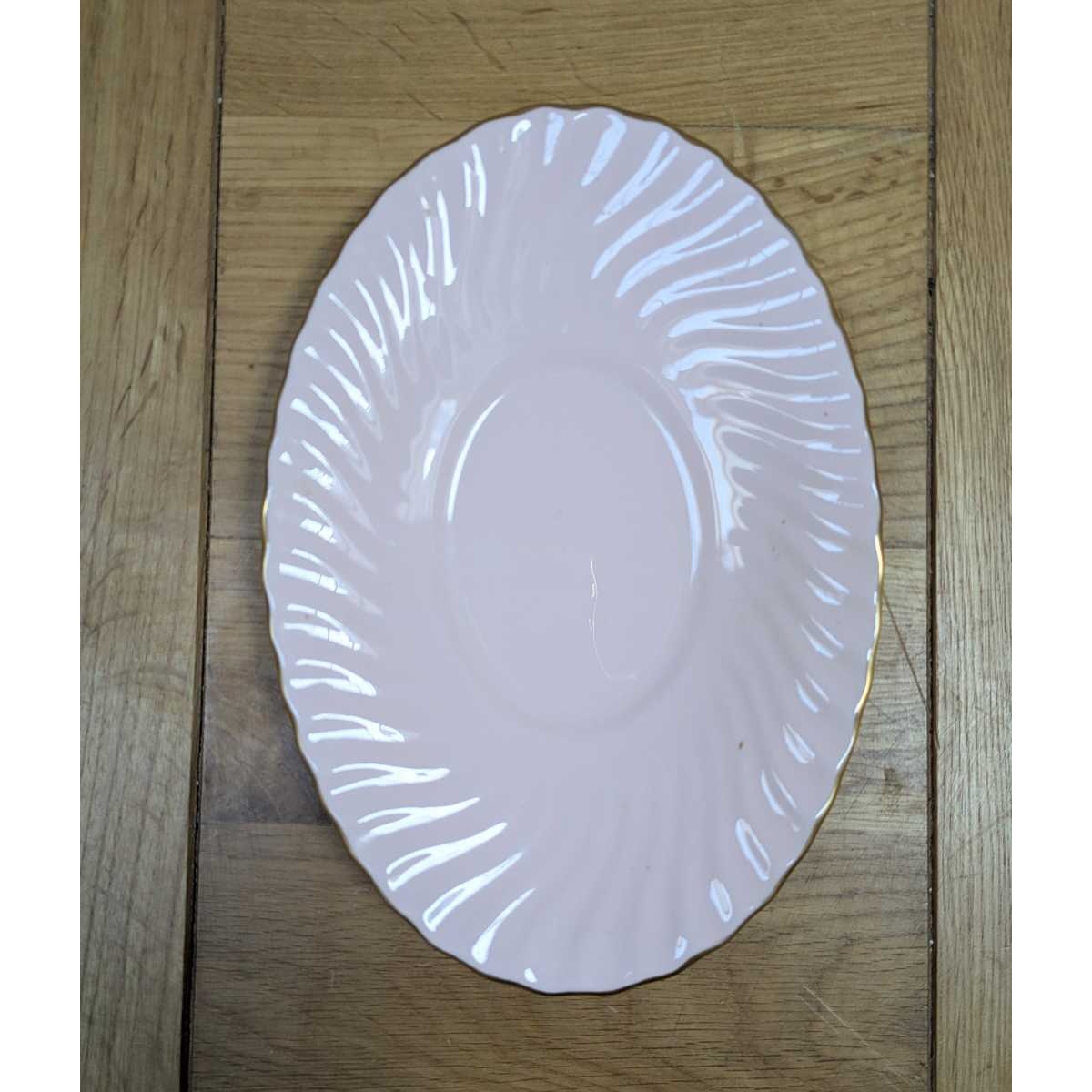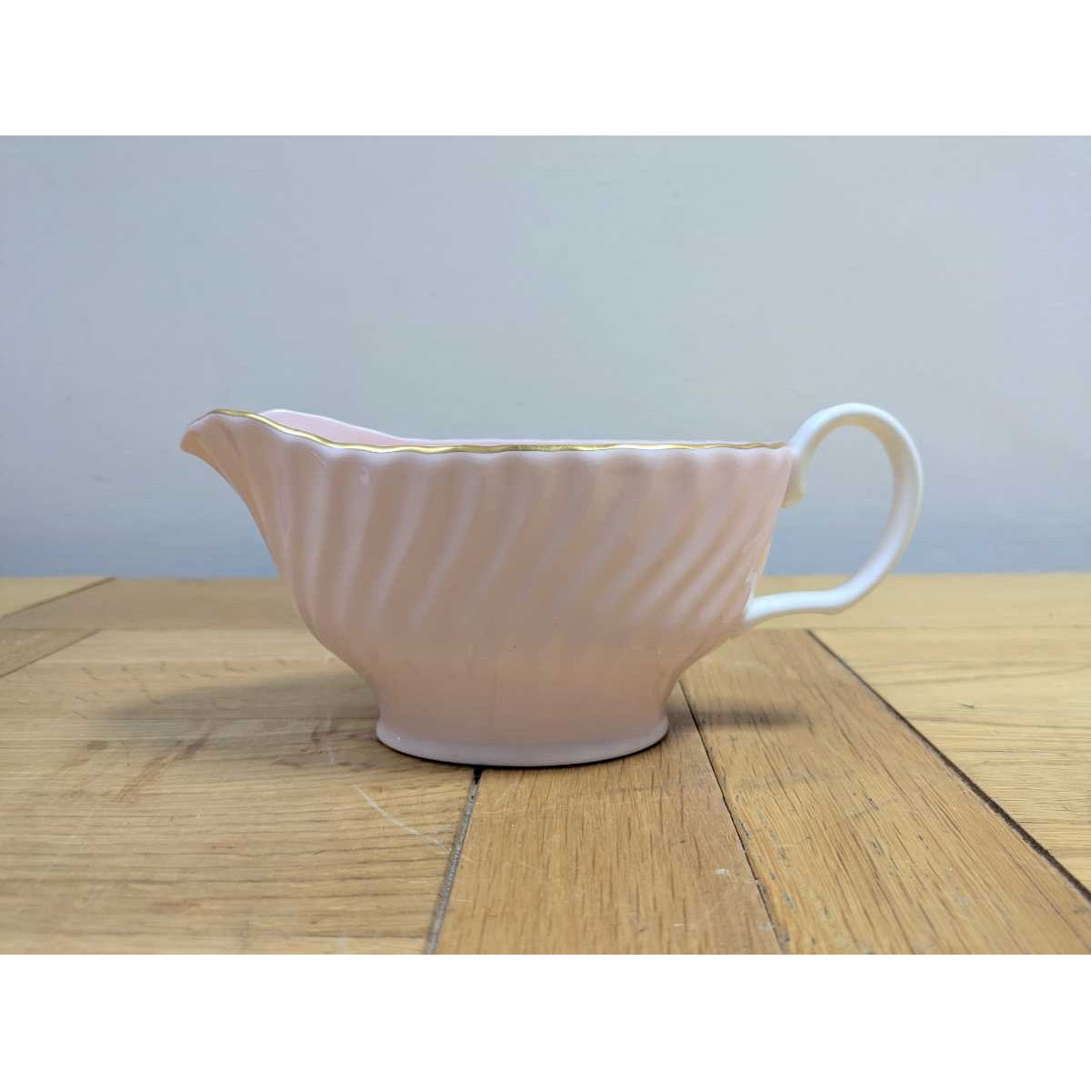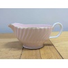 Vintage swirled and fluted Fife shell pink bone china gravy boat and saucer, with gold rim. In excellent condition.
