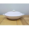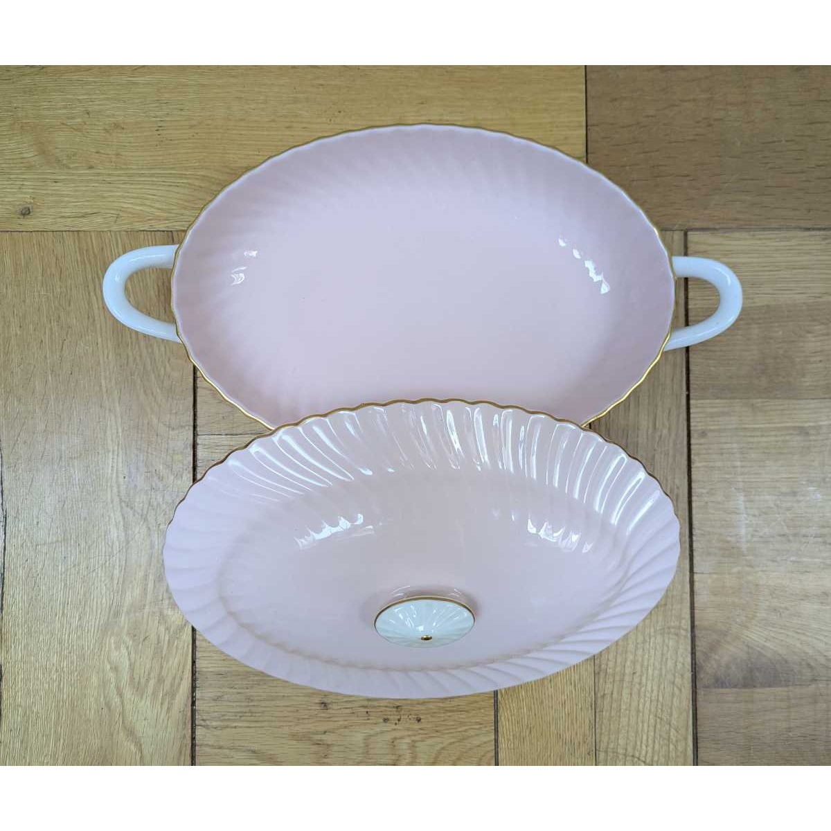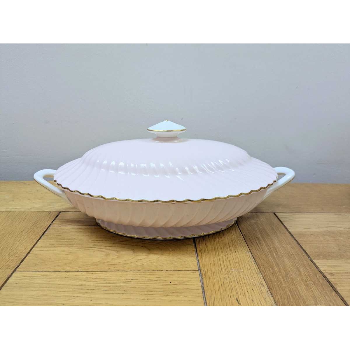Vintage swirled and fluted Fife shell pink bone china tureen/casserole dish, with gold rim. In excellent condition.