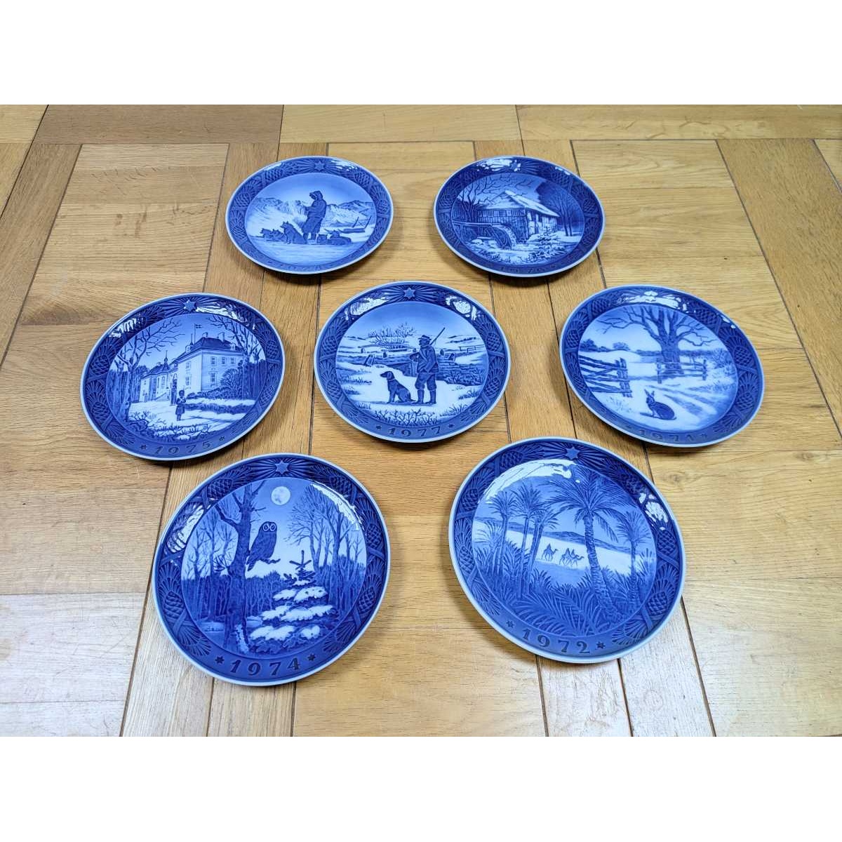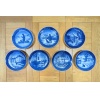 Blue 1970s Royal Copenhagen Christmas Plate Collection, consisting of 1971, 1972, 1974, 1975, 1976, 1977 and 1978. 7.25" diameter.